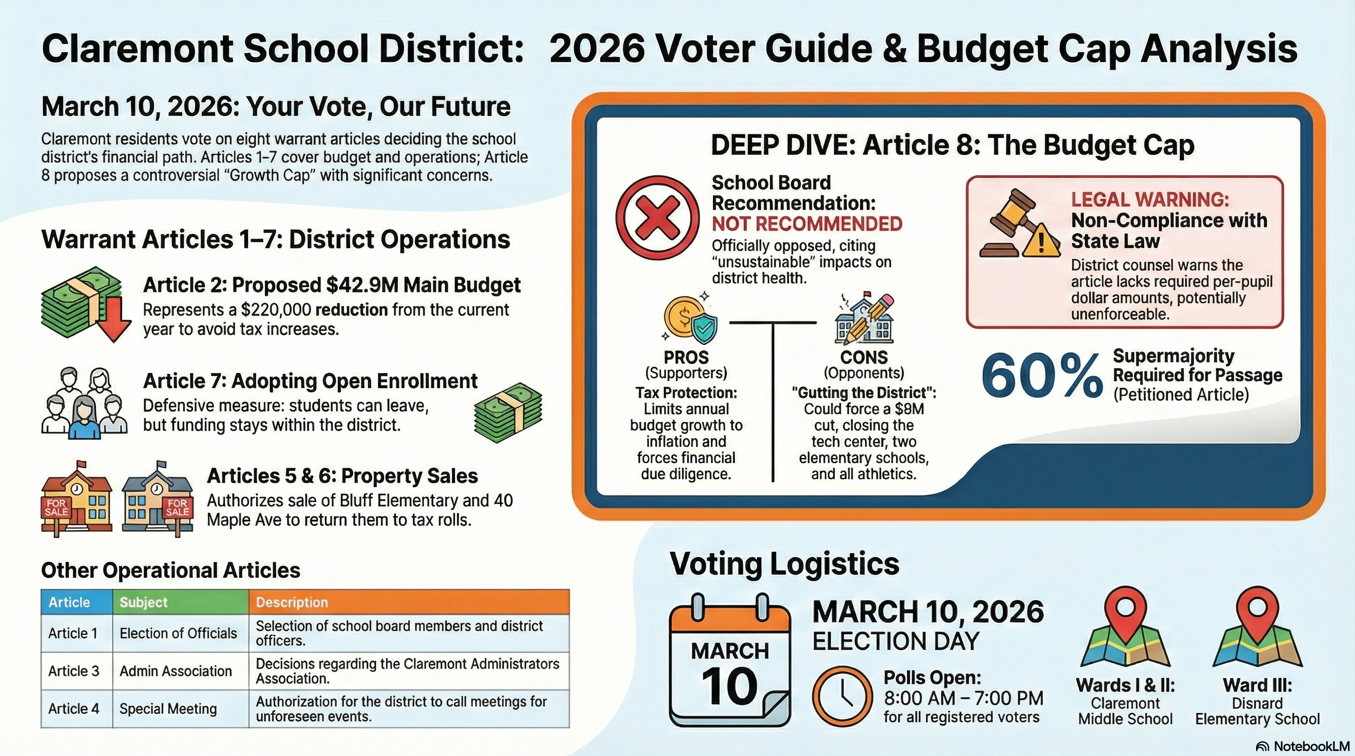 Voting LogisticsThe polls will be open from 8:00 AM to 7:00 PM for all registered Claremont voters. Ward I and Ward II: Voting takes place at Claremont Middle School. Ward III: Voting takes place a...